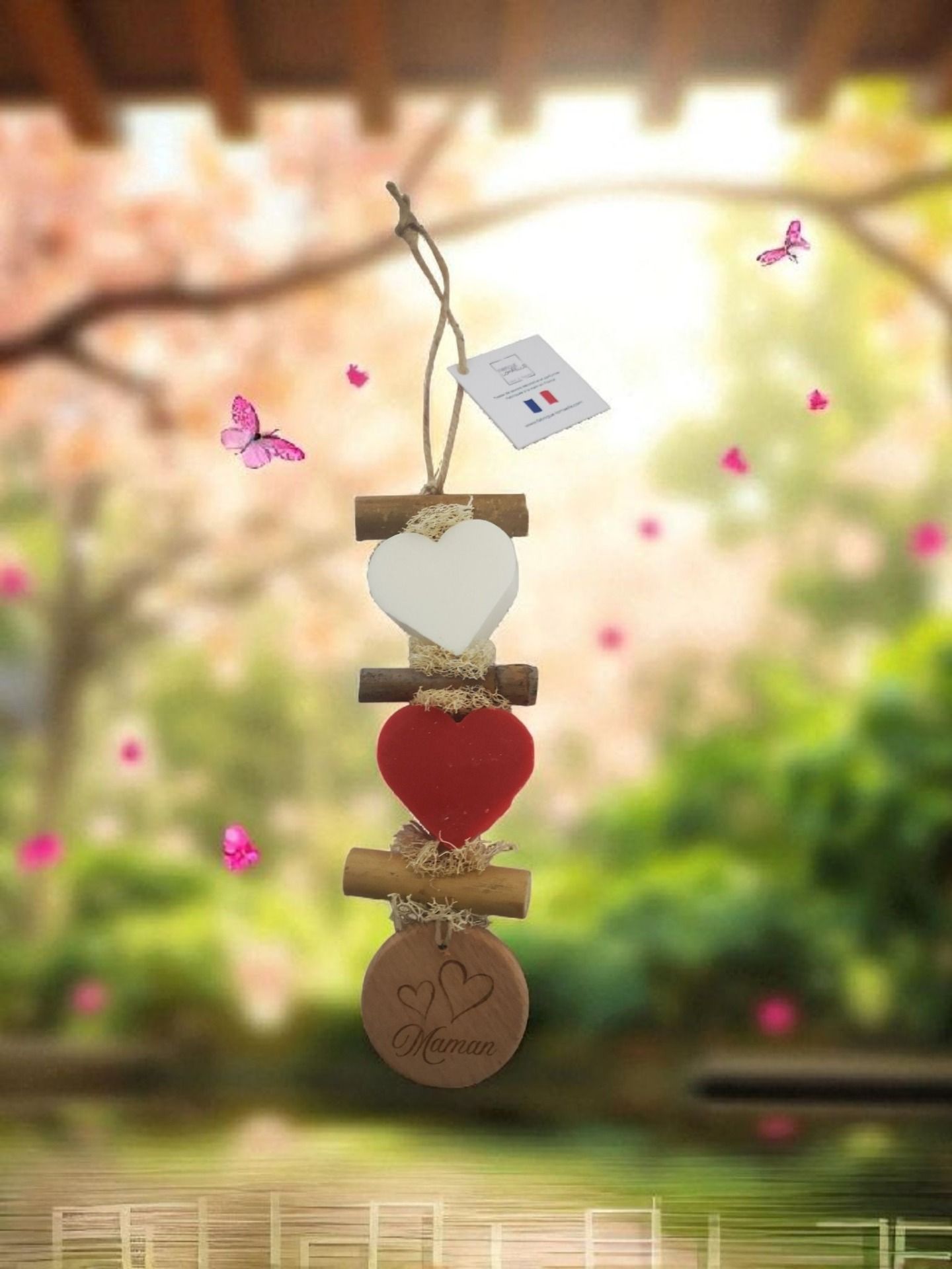 Composée de 2 coeurs fruits rouges et bergamote et un rond en bois "Maman"