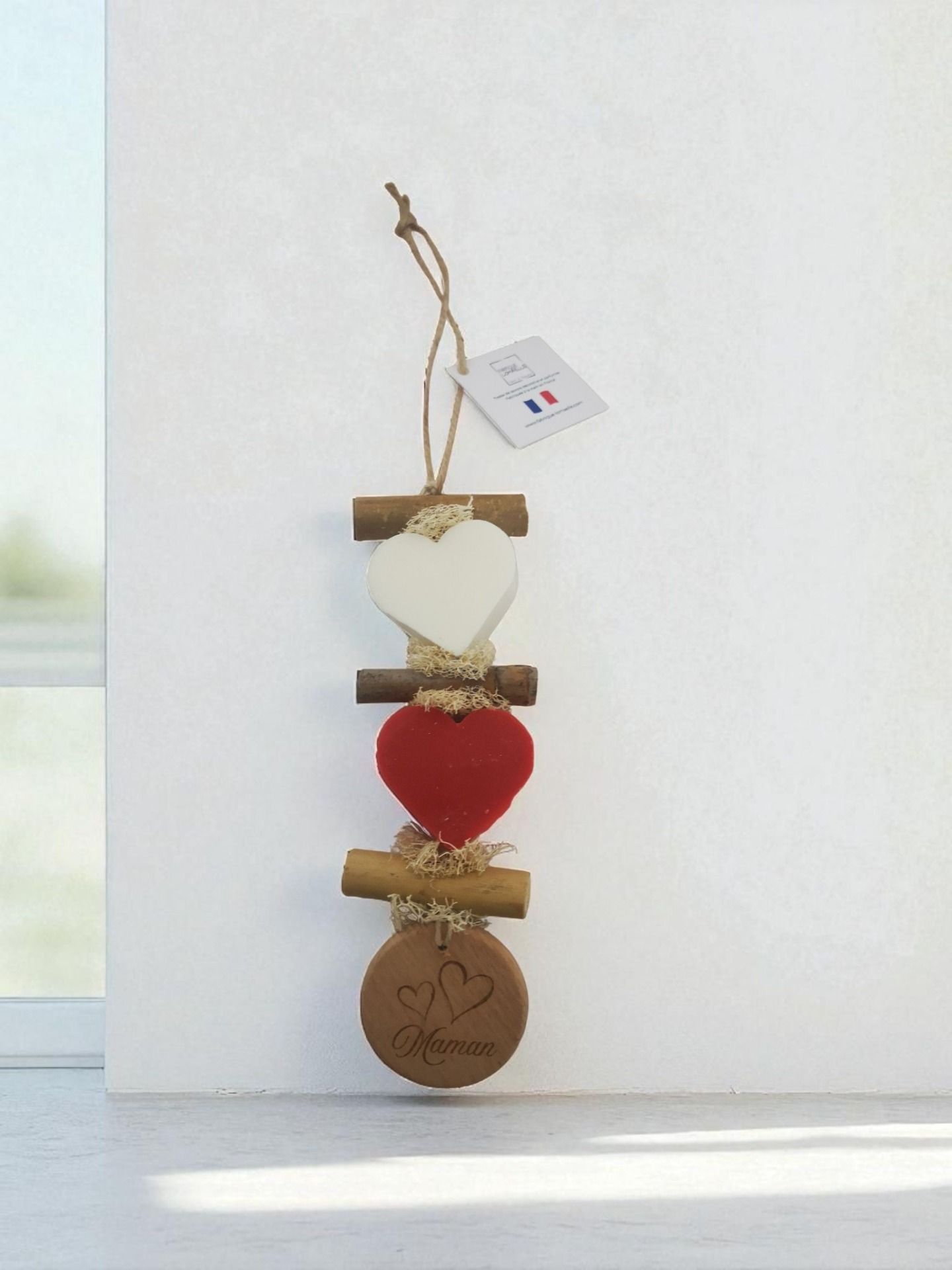 Tresse savon 2 coeurs rond en bois "Maman"